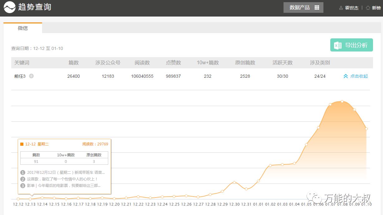 从“新榜”趋势查询来看,影片上映以来,有关《前任3》的微信文章多达2.6万篇,涉及公众号1.2万个,10w+篇数232篇。“咪蒙”“思想聚焦”“十点读书”“视觉志”等大号都纷纷参与。
