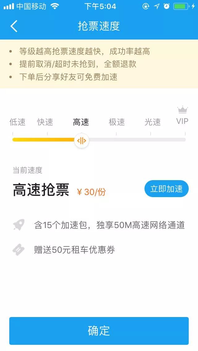 根据其抢票规则,简小编可以通过选择不同的等级,低速不用额外费用,快速、高速、极速、光速,分别对应10块、30块、40块、50块。