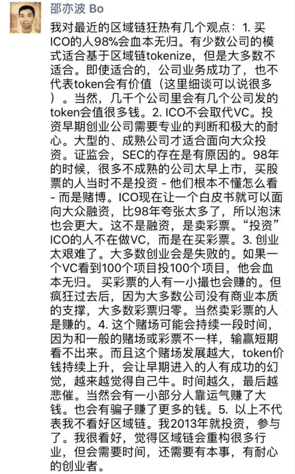 不过,知名天使投资人薛蛮子却没有徐小平那样“兴奋”,1月10日,他发文称,创投圈像打了鸡血似的,老徐太亢奋了。凡有名利的地方必然有灾祸,数字货币投资也是,有猛涨必有暴跌,很多人压根没有投资资格,涨了开心,跌了闹心,而且现在骗子那么多,烂项目占大多数,得到的便宜迟早还会还回去。