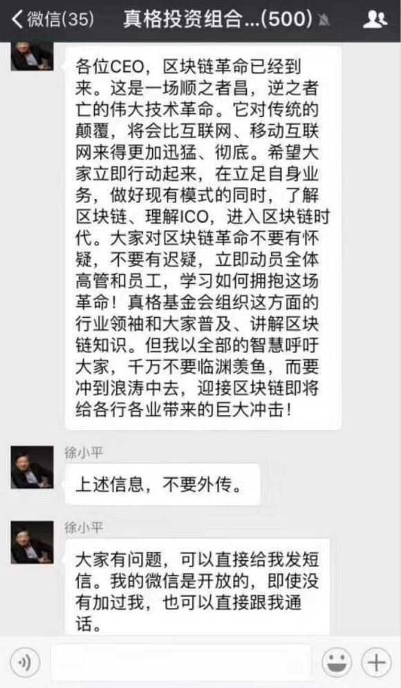 “区块链革命已经到来。这是一场顺之者昌,逆之者亡的伟大技术革命。对传统的颠覆,将比互联网、移动互联网来得更加迅猛、彻底。”1月9日,真格基金创始人徐小平在微信群中的一段分享引爆了币圈链圈。他随后再次强调,经过近几年尤其是最近半年的观察与思考,以及近期向各位区块链先知先觉者的学习请教,确立了一个信念:一场区块链革命已经降临!