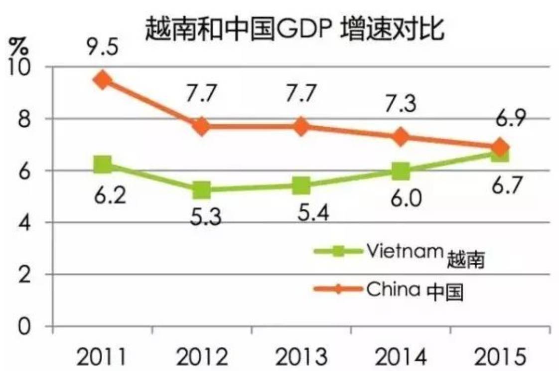 以1990年~2015年各国以美元计价的人均GDP增速为指标,则会得到一个更为夸张的数据。15年间,越南的GDP增幅为全球第二,达到了2075%,仅次于中国的2222.7%,是第三名老挝的一倍还多。中越两国近年来GDP增速的对比而言,越南的发展速度呈上升态势,并已经逐渐和中国持平,这表明了越南的经济发展进入了较为稳定的扩张阶段。