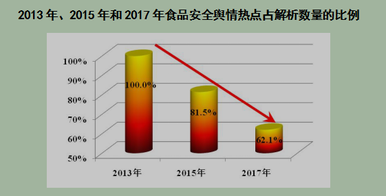 从危机应对为特征的“热点解析”,到和平时期以风险预防为特征的预警提示,从2013年的100%下降到2017年的62.1%。显示我国对食品安全风险交流的管理更加主动、从容,与世界接轨。