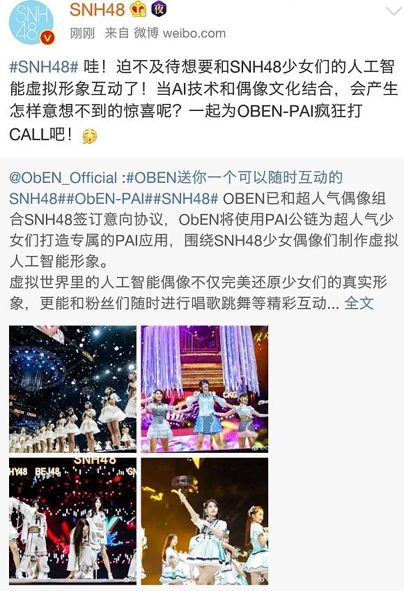 2017,女团SNH48宣布和美国个性化人工智能公司ObEN签订协议,ObEN将使用PAI公链为超人气少女们打造专属的PAI应用,围绕SNH48少女偶像制作虚拟人工智能形象。