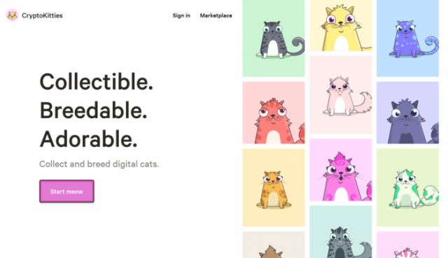 《CryptoKitties》是电子猫的养成与繁殖游戏,猫咪生成、繁殖和交易功能全部都是基于区块链平台以太坊 (Ethereum)。以太币是该游戏的唯一交易货币。两只电子猫交配而生出的子孙会遗传到他们各自的256个位元基因组,如外观、个性与特徵等,总计有40亿种可能性。根据《CryptoKitties》的交易追踪数据,该游戏的以太币交易量迄今已突破190万美元,且还在快速增加中。更不可思议的是,这款游戏占据了以太坊区块链10%以上的活动。