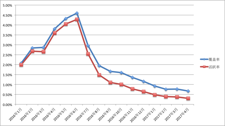 TalkingData 移动观象平台的数据显示,映客的覆盖率和活跃率从 2016 年 6 月之后大幅下跌。2017 年 4 月,两个维度的数据都已经远低于 2016 年 1 月。