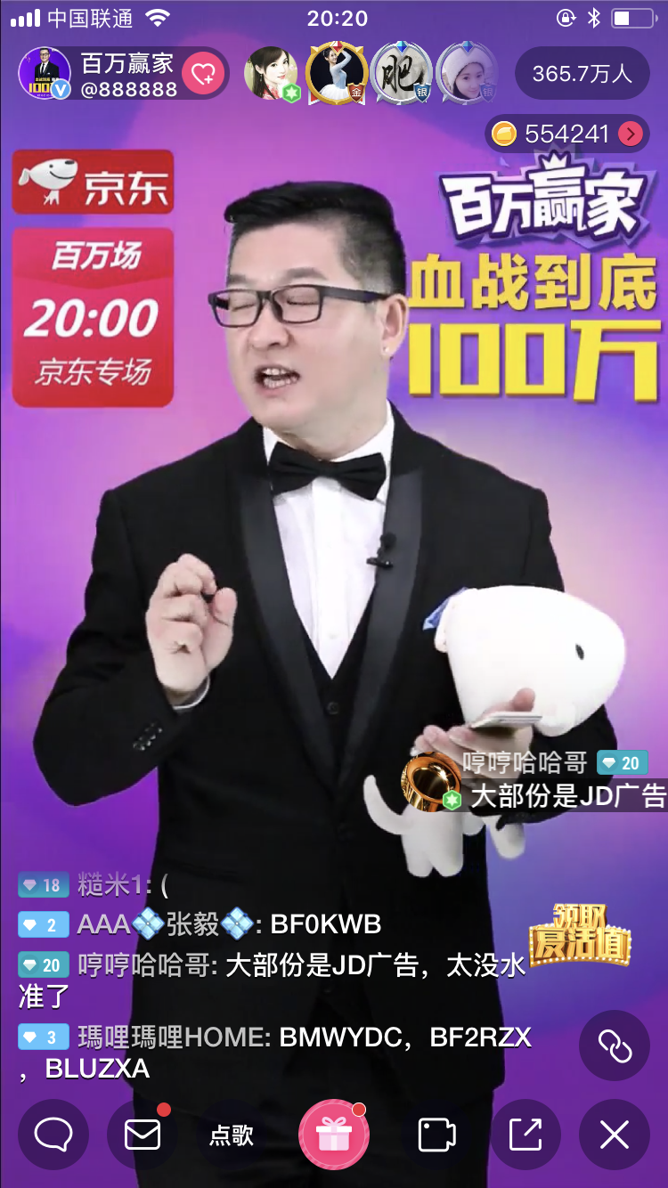 定位不明确的花椒直播也靠直播答题找到了新的用户增长点,而且花椒直播旗下百万赢家最快找到广告植入的玩法。继和美团的合作之后,花椒在 1 月 10 日又迎来第二个冠名商京东。在长达一个小时的京东专场中,主持人时不时插播京东和刘强东的广告,题目中也植入了京东物流全年无休的广告。