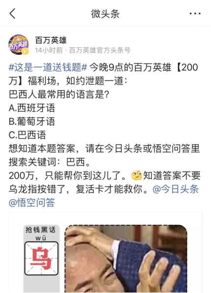 百万英雄在微头条上的官方账号以及悟空问答上,故意泄题,吸引用户关注。下载抖音、火山小视频可以获得百万英雄复活码。