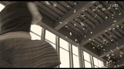 慢镜头中,濑户花一个空中转身360度摔倒了矢高北斗的怀中,然后两人四目相对······