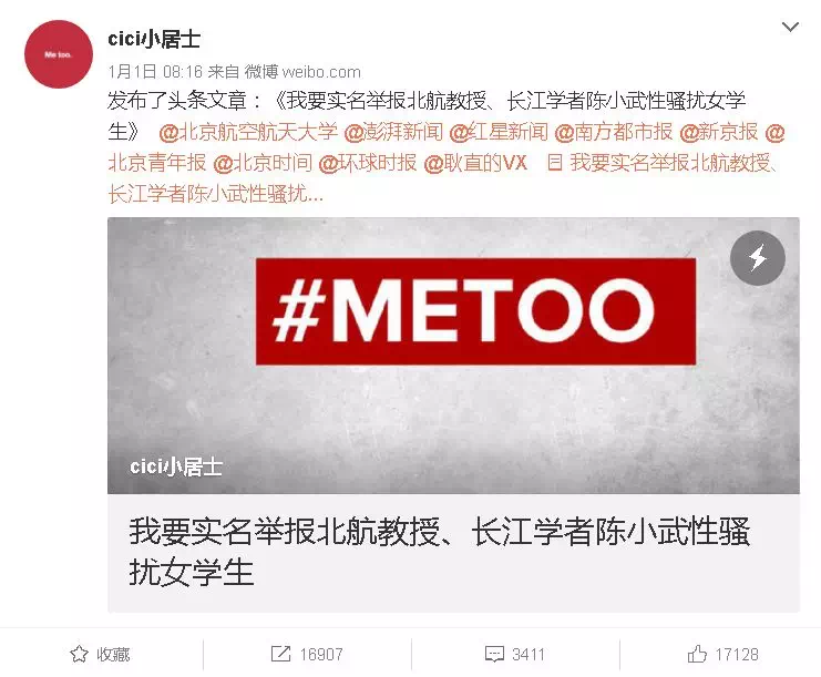 2018年开年第一天,北京航空航天大学校友罗茜茜在微博上实名举报博士生导师、长江学者陈小武长期性骚扰女学生。罗茜茜称,她12年前在北航读博期间就曾被自己的副导师陈小武性骚扰,其门下许多女学生都有过类似经历,她们一起向北航纪委提供了证据,希望校方能够严肃处理。当晚,北航就在其官方微博上发布声明,称已在第一时间成立了工作组,将迅速开展调查核实。十天之后,北航发布了调查处理通报,通报称“经研究决定,撤销陈小武研究生院常务副院长职务,取消其研究生导师资格,撤销其教师职务,取消其教师资格。”
