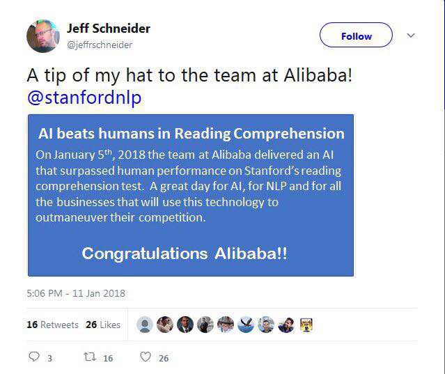 当然了,AI是不会去跟你比托福刷分的。但AI通过机器阅读理解,撬动理解力这扇大门开启,意义也远远不是测试和排名所能概括的。国外网友和AI从业者,面对这个中国公司完成的壮举纷纷脱帽致敬,将其列为2018伊始AI的重要突破,卡内基梅隆发现计算机科学学院机器人研究所的研究教授Jeff Schneider等等业界大牛也对阿里团队表示了致敬。