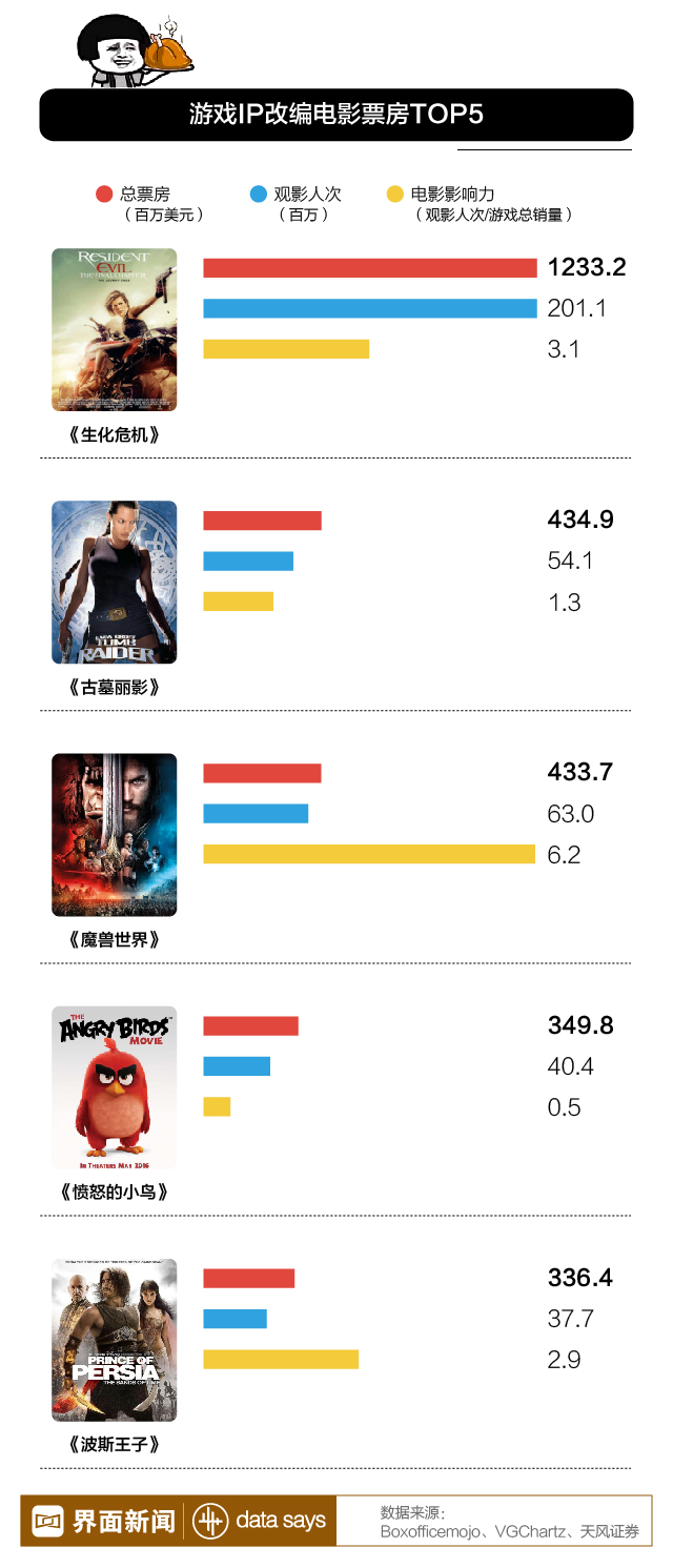 据天风证券统计,目前共有18款游戏被改编成了电影,全球总票房达到38.6亿,总估计观影人次为5.4亿,是游戏总销量的0.9倍,其中影响力最大的游戏IP电影是《魔兽世界》,观影人次数是游戏总销量的6.2倍。此外,考虑到游戏用户存在对游戏的重复购买的行为,所以该数值存在较大低估可能性。