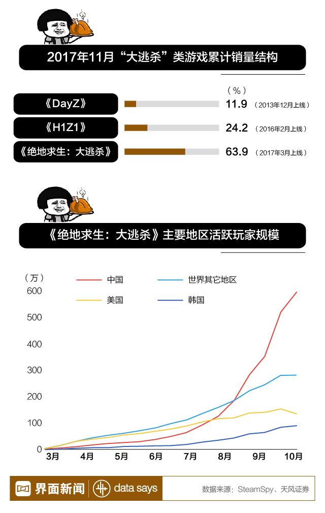 2017年3月,《绝地求生》上线。仅五个月后,《绝地求生》销量就超过了《H1Z1》。截至当年11月9日,《绝地求生》在全球范围内销售1997.9万套,拥有玩家1987.2万,在所有“吃鸡”端游中占有绝对的优势。