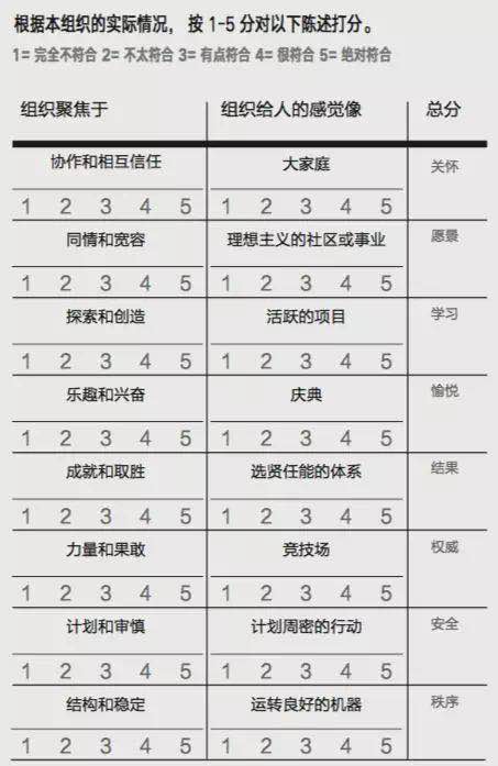 开始着手塑造组织文化之前,领导者有必要先了解现状。这张测评表和下面列出的问题,能帮助你对本公司的文化风格形成初步认识,并开启讨论。