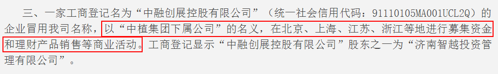 根据中植集团在官网发布的公告,涉嫌冒名的公司有三家,分别是:济南智越投资管理有限公司(下称:济南智越)、红图(北京)资本管理有限公司(下称:红图资本)和中融创展控股有限公司(下称:中融创展)。