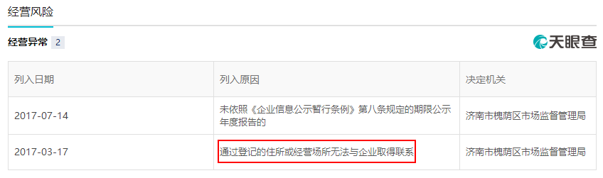 有意思的是,这家公司并没有正常经营多久。在成立3个月后,就被当地的市场监督管理局列入了经营异常,原因是登记的场地找不着人。到7月,这家公司貌似彻底“黄了”,连年度报告也没有按时公示。