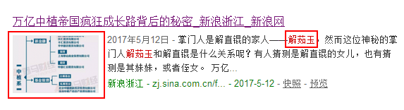 为进一步了解情况,野马财经(微信公号:ymcj8686)在百度上以“解茹玉”三个字进行搜索,出现了一篇名为《万亿中植帝国疯狂成长路背后的秘密》的文章。