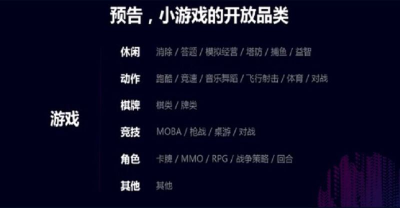 目前微信推荐了6大类、24小类是已经被验证和磨合的品类,需要通过不断迭代,在未来实现支持全品类的游戏。