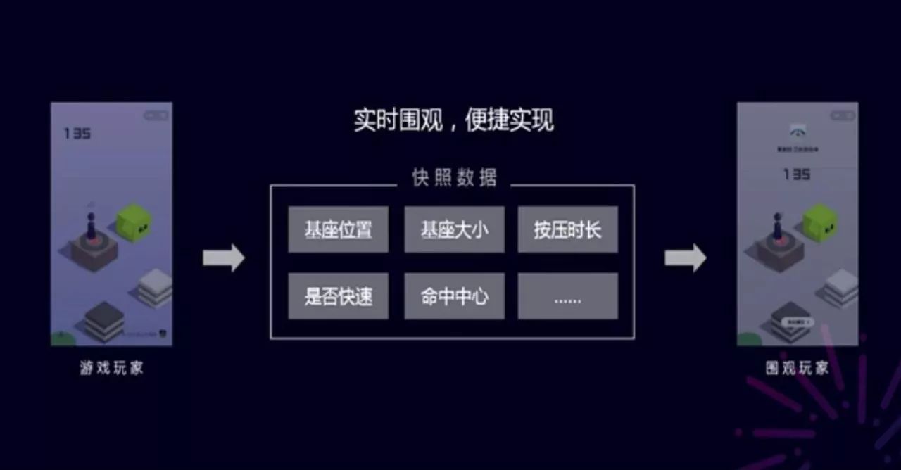 1.上文提到,围观模式是非常有效的社交设计。但海量用户同时观看会造成额外的负担。在《跳一跳》的围观模式中,团队将最关键的快照数据同步到云端,随后通过云端同步到围观玩家。因为引擎保持一致,所以能做到实时观看。据透露,5千到1万围观用户的情况下,延迟不超过1秒。