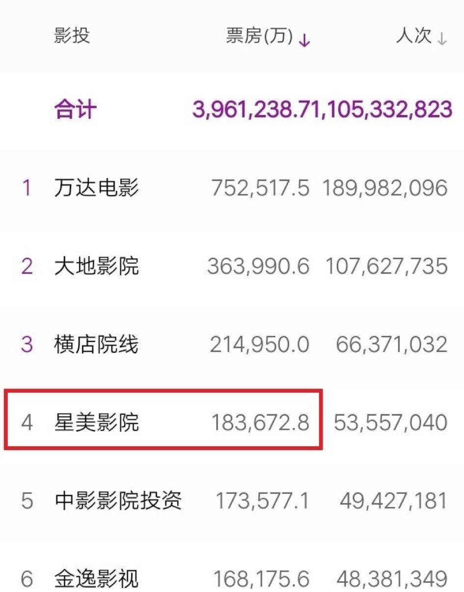 这个数据在国内院线市场是名列前茅的。根据院线龙头万达院线的数据,其拥有已开业影院455家,银幕4000块;大地院线旗下拥有已开业影院 789 家,4252 张银幕;其他如横店影视、时代院线等数据比星美相对少一些。