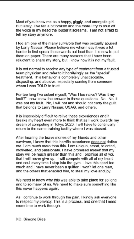 “我也是拉里·纳塞尔众多的性侵受害者之一,你们大多数人都知道我是一个快乐的,傻傻的且充满活力的姑娘,但最近我的这种感觉已经被打破了,我越想把外界的声音屏蔽掉,就感觉有更大声的尖叫要出来,我并不惧怕再讲出我曾经的故事,”拜尔斯在公开声明中写道。
