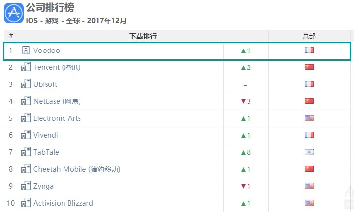 在全球iOS游戏厂商下载榜中,排在第一位的是来自法国的Voodoo。去年能够排到这个位置的厂商只有三家,分别是腾讯(1月-10月),网易(11月,吃鸡手游大爆发)和Voodoo(12月)。