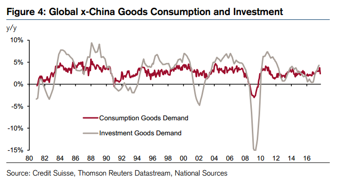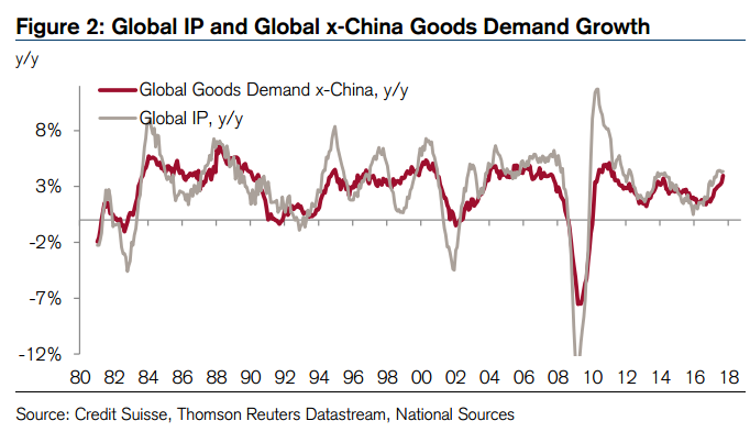 瑞信认为,对于2018年全球经济将如何演变,关键问题在于工业产出会否超越需求,正如1993-1994曾出现的那样,或者和需求齐头并进,类似2013年。