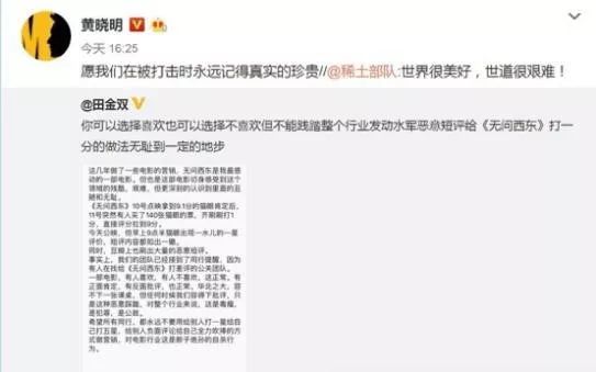 1月12日,娱乐营销人田金双在微博发文称,早在影片点映阶段,就有公关团队出于营销目的在猫眼和豆瓣等平台上给《无问西东》打低分、刷恶评,直接导致电影的评分有所下滑。对此,他表示:“给别人负面评论给自己全力吹捧的方式做营销,对电影行业这是断子绝孙的自杀行为。”