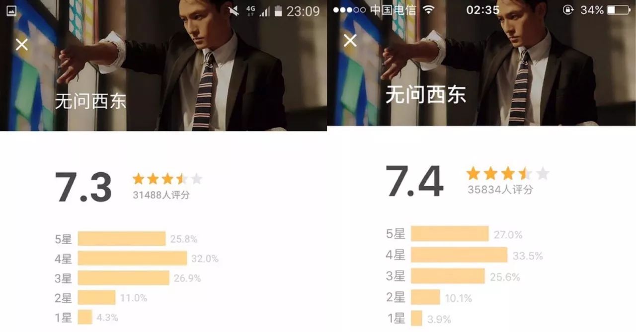 但没想到,仅仅过了一夜,影片的豆瓣评分就飙至7.1分,而今更是增至7.4分。评分速涨背后,豆瓣八组有网友发文称,《无问西东》存在人为的刷高分行为,大半夜三个小时内涨了数千五星好评。一时间,一场围绕着《无问东西》豆瓣评分的拉锯战已经打响。
