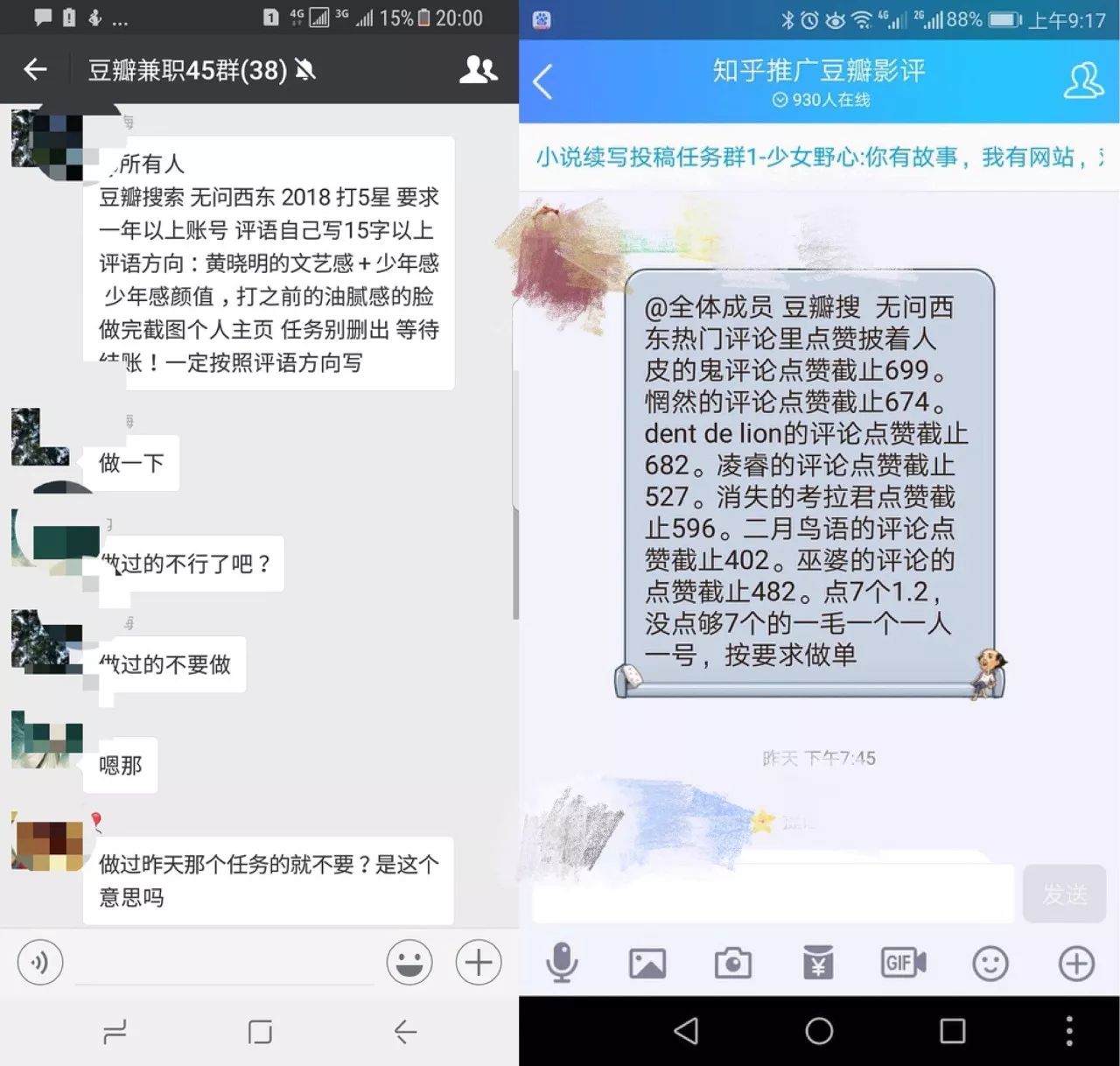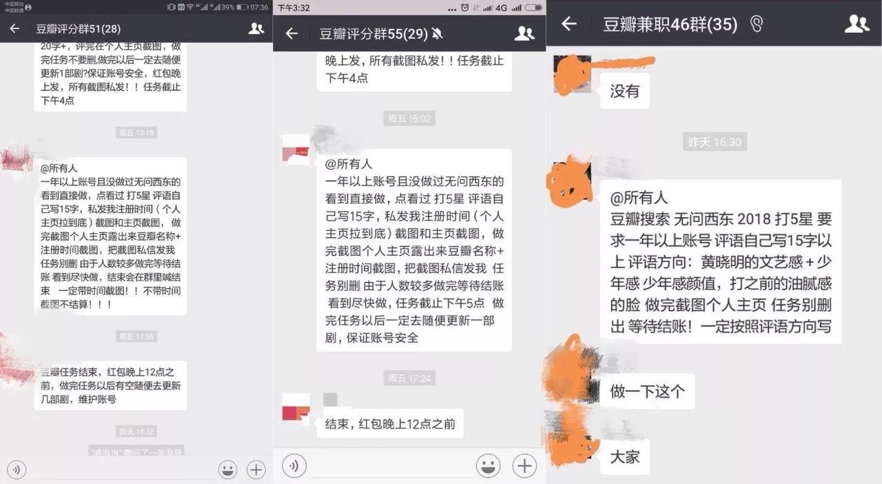 此外,该文章还曝光了几个豆瓣刷分、兼职群的聊天记录,指出针对《无问西东》的刷分行为曾同时在多个相关群内展开。某位加入了刷分群的豆瓣网友向壹娱观察证实,这样的群的确存在,且每个群收到的任务方向还各不相同,有的群要求针对黄晓明颜值、“少年感”发表评论,“打脸”此前的差评,有的则是给电影豆瓣短评里的几个四五星短评点“有用”,所有参与了刷评的网友都能收获一个5元的红包。该网友也曾针对电影刷好评的事情在八组发布过帖子,但昨日下午,该帖却遭到了删除。