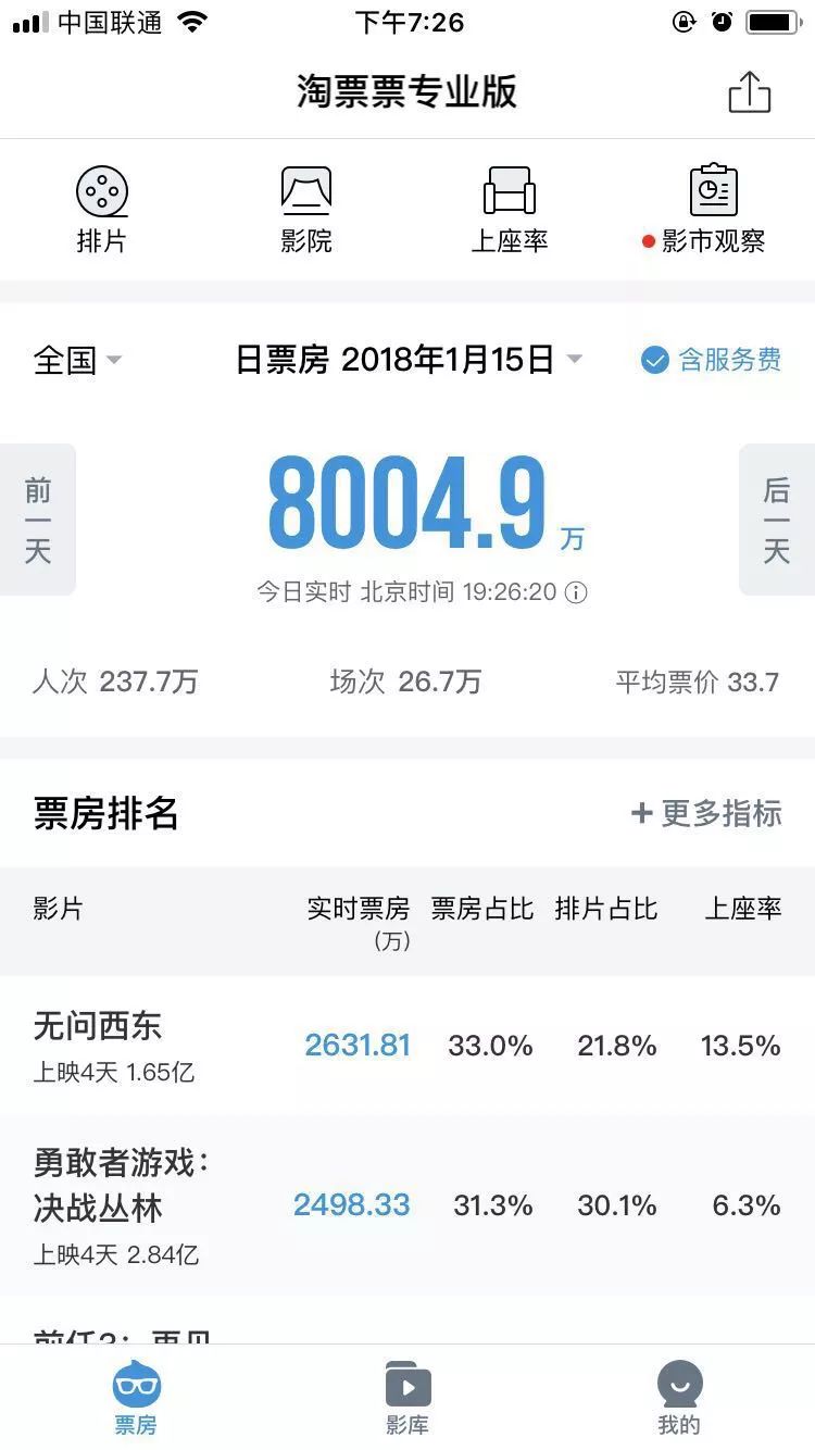 伴随着豆瓣评分的变化,《无问西东》首周末的票房也开始增长,从首日3500万一路翻升至周日的5500万左右,在单日票房超越《前任3》的同时,和排名第一的《勇敢者游戏》之间的差距之间也不断缩小,1月15日当天的大部分时间里《无问西东》的票房甚至处于领先,直到夜间才被超越。