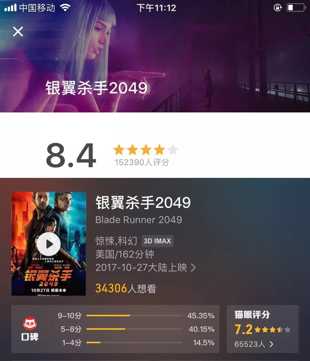 就此,电影行业观察者武剑告诉壹娱观察,一部票务平台得分高的影片容易赚钱,而一部豆瓣评分高的电影容易拿奖。“像《银翼杀手2049》很明显就反映了电影发烧友们的爱好,在豆瓣上评分很高,可高票房是由人民的汪洋大海推升的,而不是少数电影发烧友。这也是票务平台评分目前比豆瓣有用的原因,豆瓣在这一层面上已经不代表大众了。”