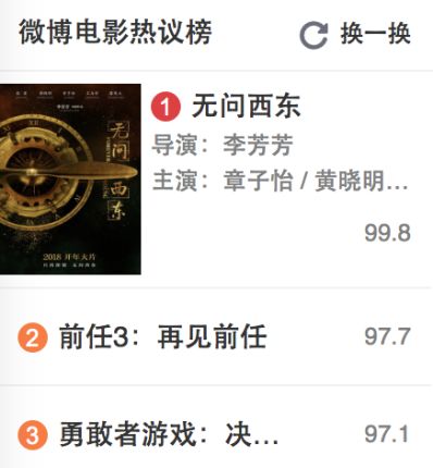或许是受由此引发的热议影响,从12号晚些时候开始,《无问西东》的豆瓣评分逐渐开始回升,直至13日已跃升至7.1分,上涨了近1分,而今更是达到7.4分之多。与此同时,电影的网络热度也是逐日攀升,截至目前为止,其微博热度已高居热议榜第一位,领先于《前任3》和《勇敢者游戏》。不过值得一提的是,电影的猫眼评分却仍在不断走低,目前已从点映阶段的9.1分下降至8.6分,比《前任3》低了0.6分。