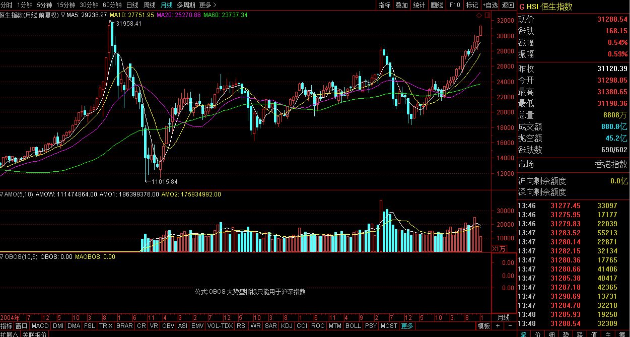 ▲恒生指数月线图。恒指距离2007年10月创造的31958点的历史高点只差2%的涨幅。