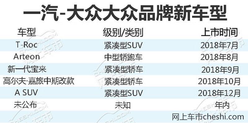 根据产品规划,2018年一汽-大众将投放A级主流SUV T-Roc、中高端 SUV、基于MQB平台的全新一代宝来、全新一代CC和新高尔夫·嘉旅 5款新产品。