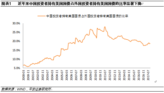 截至2017年10月底,作为美国国债市场的最大外国投资者,中国投资者持有美国国债存量为11892亿美元,占到外国投资者持有美国国债规模的18.7%。事实上,在2011年7月,中国投资者持有美国国债的存量曾经达到过13149亿美元的峰值,同期中国投资者持有美国国债占外国投资者持有美国国债的比率也达到28.2%的峰值(图1)。不难看出,与峰值期相比,当前无论中国投资者持有美国国债的规模还是占比均显著下降。
