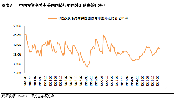从图2中可以看出,从2010年6月底至2014年6月底,中国投资者持有美国国债与中国外汇储备的比率,由高点的45.3%趋势性下降至低点的31.8%。这说明中国投资者的确在主动降低美国国债的持有规模。然而,从2014年6月底至2017年10月底,上述比率则由31.8%趋势性地上升至38.2%。这说明在后一阶段,中国投资者整体而言是在提高美国国债的资产占比。