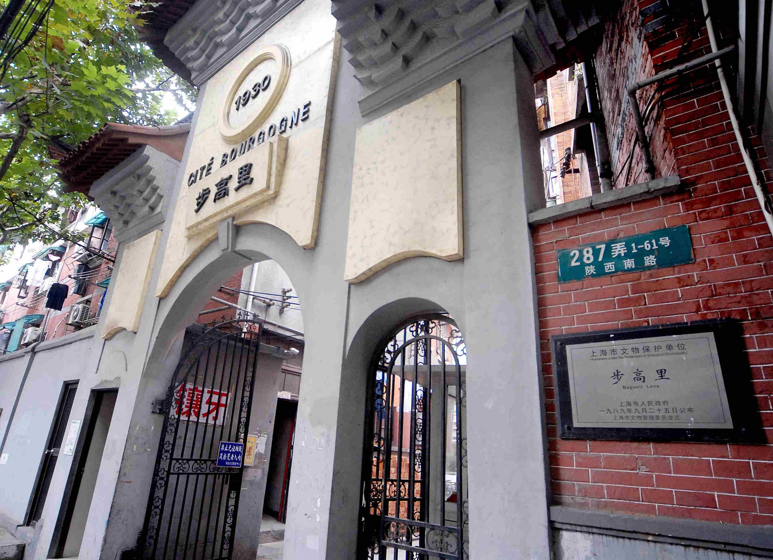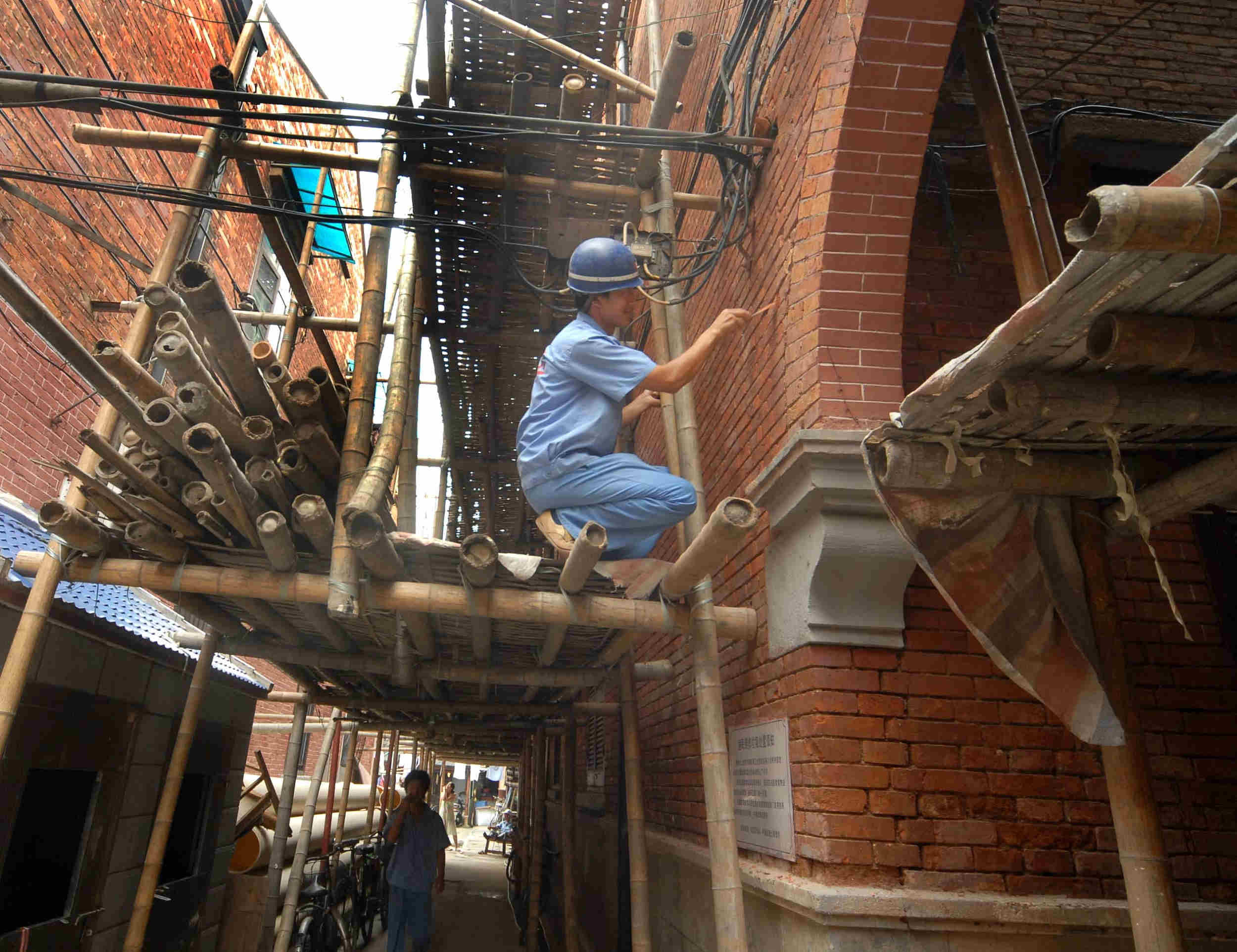 2008年8月31日,上海陕西南路建国西路口的著名老建筑——“步高里”居民区正在进行保护性地修缮施工。 工人们正对“步高里”的外墙面进行修补,“修旧如旧”地还原其历史风貌。