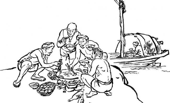 相传在江湖袍哥的年代,当时的朝天门码头是牲口屠宰集中地。零卖小贩将水牛毛肚洗净放到辣锅涮煮,竟发现异常美味,周边的船夫也被这香味吸引。慢慢的一个锅被分成了九块,以便不同的食客食用。一张八仙桌,四面坐着的都是陌生人,一人一格,在自己面前的格子里涮,互不占便宜,且烫且吃,吃若干块,算若干钱。