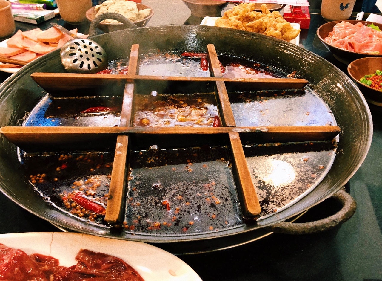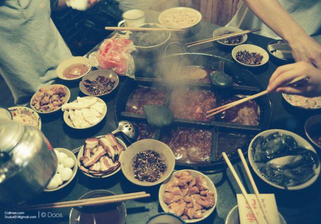 这毛肚鸭肠的,一般要先烫,还要夹着烫,涮几下就好了!烫久了,老得根本难以咀嚼,不夹着烫可能在锅里就找不着了。土豆芋儿这些含淀粉类的食材要吃个小饱的时候开始烫,因为这些食材会浑锅,煮久了容易煳锅也容易化掉了。