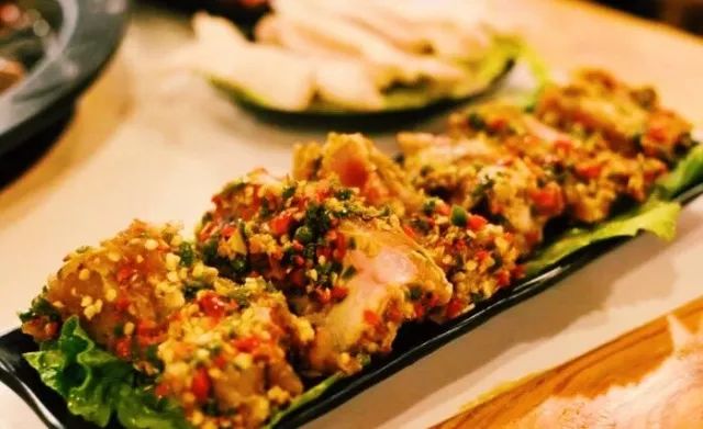 香辣大排骨,烫熟的排骨拿到手上啃,一份滋润,劲道。贡菜霸王牛肉更是新鲜,腌制好了的嫩牛肉,铺满干海椒面,内裹上新鲜的绿色贡菜,口感特别好。
