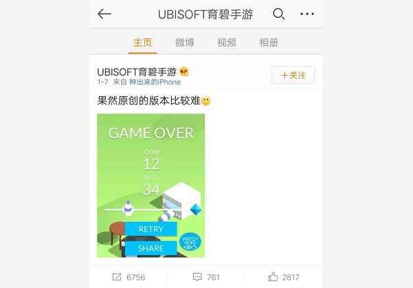 前几日,育碧手游官方微博还发布了一条耐人寻味的微博,称“果然原创的版本比较难”,似乎是在暗示腾讯模仿。但后来该微博也在评论中回复称,没有暗示,你们不要瞎猜。