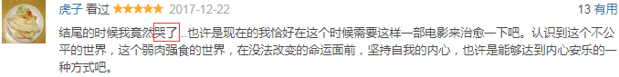 “结尾的时候我竟然哭了...认识到这个不公平的世界,这个弱肉强食的世界,在没法改变的命运面前,坚持自我的内心,也许是能够达到内心安乐的一种方式吧。”