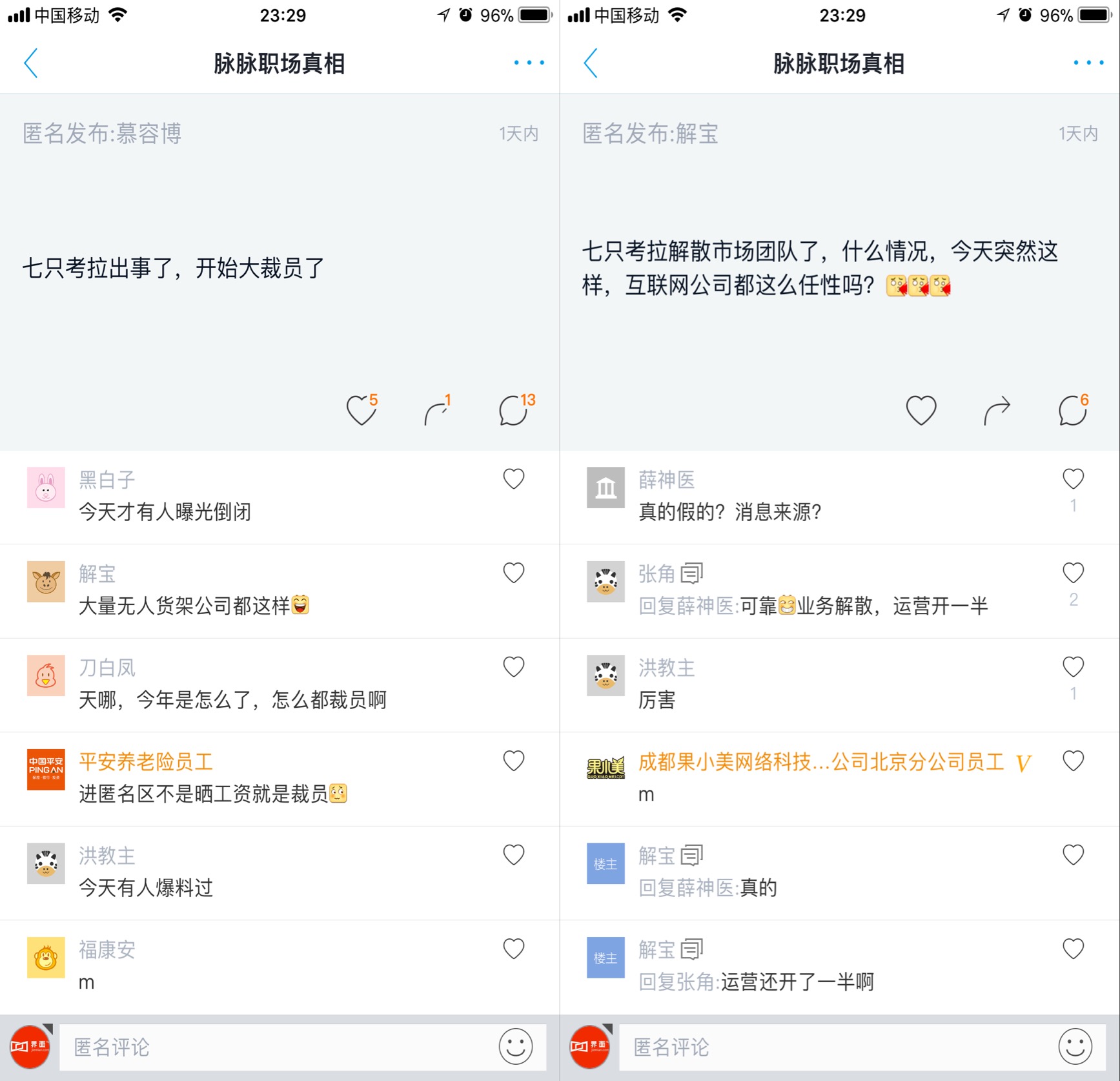 随后的几个小时,社交平台脉脉上也有人匿名发布相关信息,“七只考拉出事了,开始大裁员了。”还有人在评论中回复道,“可靠,业务解散,运营开一半。”