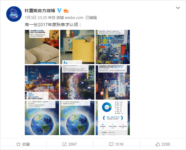 一向在追热点上不落人后的杜蕾斯最近又瞄上了年度盘点,网易云音乐和支付宝分别推出的个人年度歌单、年度账单先后在朋友圈刷了屏,杜蕾斯也趁热推出了两份杜蕾斯版的年度歌单与账单。让网友不得不叹服杜杜的文案与速度。