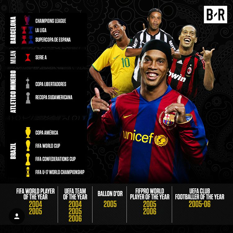 2003年夏天,小罗以3000万欧元加盟巴塞罗那,从此身披10号球衣的他与球队一起走上巅峰。在巴萨效力的5个赛季中,小罗各项赛事出场207次打进94球,帮助红蓝军团夺得2个西甲冠军、2个西班牙超级杯冠军和1个欧冠冠军,他个人也在2005年包揽世界足球先生和金球奖。此外,在注重传承诺坎普,小罗对青年梅西的影响和指引更是世界足坛的一段佳话。