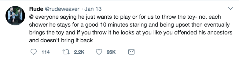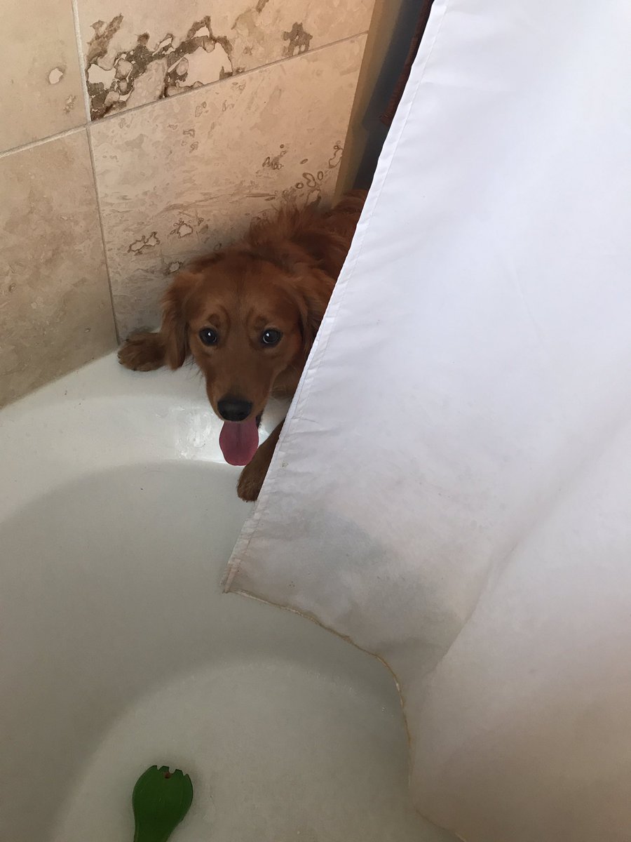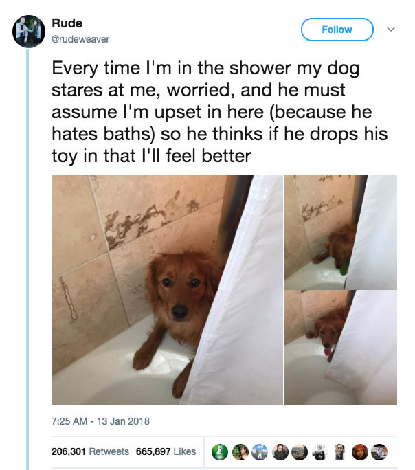 每次我洗澡的时候我家狗子就一直盯着我,特别担忧的样子,他肯定觉得我洗得特别难受(因为他超讨厌洗澡),所以他认为把他的玩具叼进来我会开心一点。