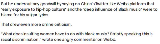 首先,当PG One被官媒点名批评歌词侮辱女性、现场演出侮辱逝者、道德败坏以及价值观与主流产生冲突时,他将上述的锅甩给了“黑人音乐”。《每日邮报》在报道中引述了微博用户的观点,“为何女性一定与黑人音乐有所干系?严格来说,这是种族歧视的行为。”