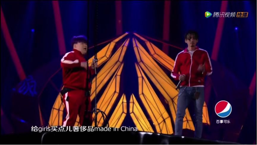 比如,在1月13日的腾讯烎潮音发布夜上,虽然红花会、Higherbrothers、周震南、马伯骞、KOHH等嘻哈歌手的表演并未受到太多限制,但歌词的自我审查已经开始。比如,Higherbrothers的《Made in China》表演中,虽然唱的仍是“Bitch”,但歌词字幕已贴心地将其净化成为“Girls”。