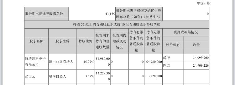 然而,截止2017年上半年,公司实际控制人潍坊高科所持有的5498万股中,3500万股处于质押状态,2490万股处于冻结状态。根据潍坊高科与上海光大证券资产管理有限公司签署的相关协议及协商议定,前述股票质押的预警线为人民币 8.00 元/股、平仓线为人民币 7.55 元/股。
