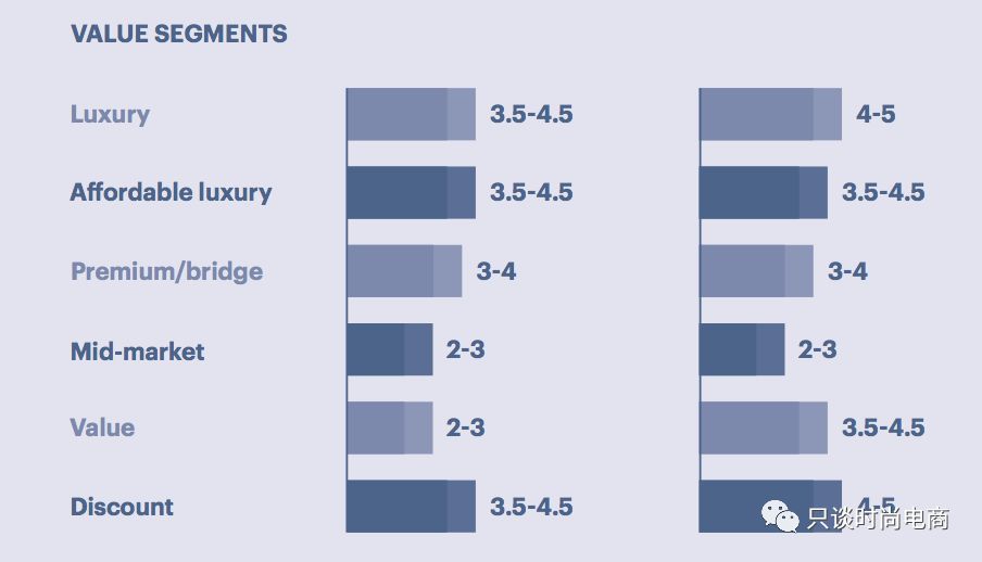 经济拖后腿,在2016年、越来越少的顾客购买正价品,价格底限不断突破。顾客带着“淘宝”的心理寻找高性价比商品,时尚品牌使用打折渠道来加速去库存。在英国,一年有多达6个打折季;大型时尚百货开设自己的奥莱频道。在中国,奥莱店铺非常火爆,预计2018年,工厂店的销售达122亿美元。分价格带数据里,除去轻奢,最便宜的低价折扣层是发展最好的。